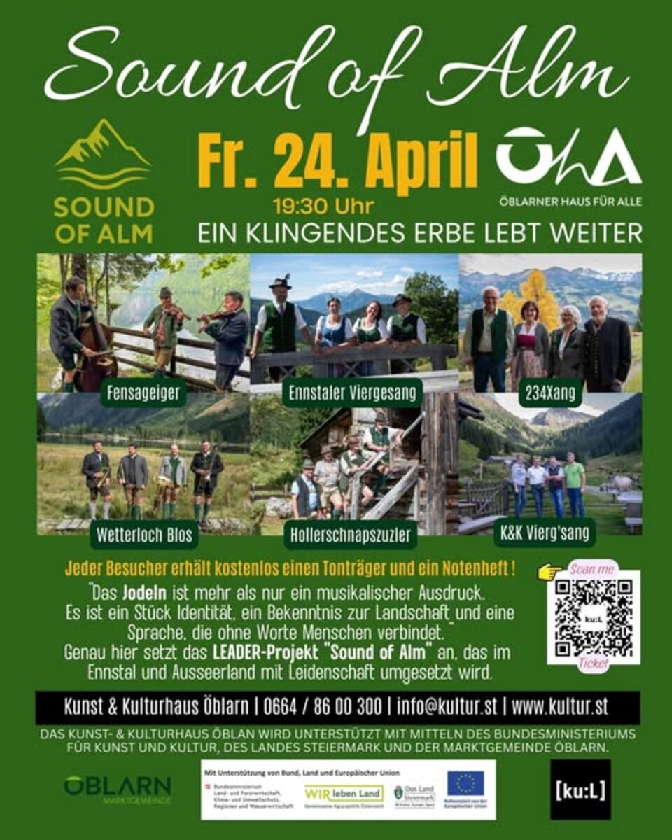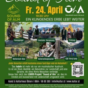 Das Kunst & Kulturhaus Öblarn freut sich, Sie ins Öblarner Haus für Alle einzuladen. Dort erwartet Sie der festliche Abschluss des Projekts "Sound of Alm" – ein Abend voller Musik, Begegnung und besonderer Eindrücke.