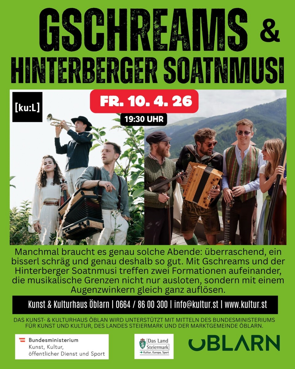 Als Support bringt die Hinterberger Soatnmusi genau jene Mischung mit, die perfekt dazu passt: tief verwurzelt in der Ausseer Volksmusik, gleichzeitig offen für alles, was darüber hinausgeht. Ob Swing, Balkanklänge oder Wienerlied – die Mitterndorfer Multiinstrumentalisten verweben unterschiedlichste Einflüsse zu einem eigenständigen, lebendigen Klangbild. Dabei bleibt immer dieser feine, unaufgeregte Schmäh spürbar, der ihre Musik so besonders macht.